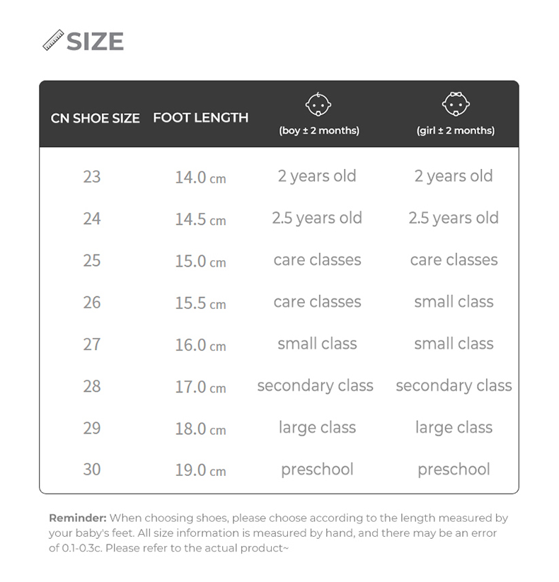 Size: 23 size fit foot length 14.0cm 24 size fit foot length 14.5cm 25 size fit foot length 15.0cm 26 size fit foot length 15.5cm 27 size fit foot length 16.0cm 28 size fit foot length 17.0cm 29 size fit foot length 18.0cm 30 size Suitable for foot length 19.0cm