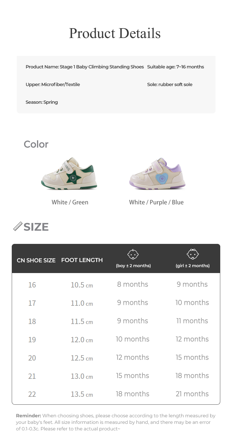 Size: Size 16 Fit Foot Length 10.5cm 17 fit foot length 11.0cm 18 Fit foot length 11.5cm 19 Fit foot length 12.0cm 20 fit foot length 12.5cm 21 fit foot length 13.0cm 22 fit foot length 13.5cm
