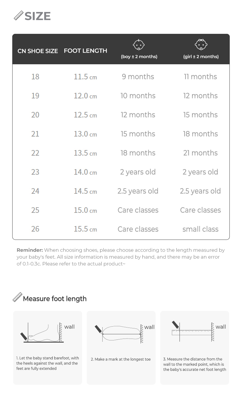 Size: 18 size fits foot length 11.5cm 19 size fits foot length 12.0cm 20 size fits foot length 12.5cm 21 size fits foot length 13.0cm 22 size fits foot length 13.5cm 23 size fits foot length 14.0cm 24 size fits foot length 14.5cm 25 size fits foot length 15.0cm Size 26 Fits Foot Length 15.5cm